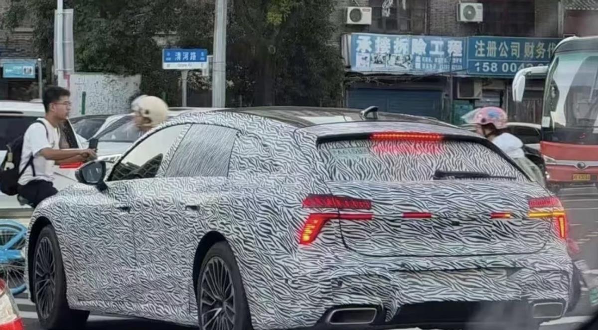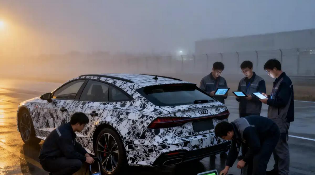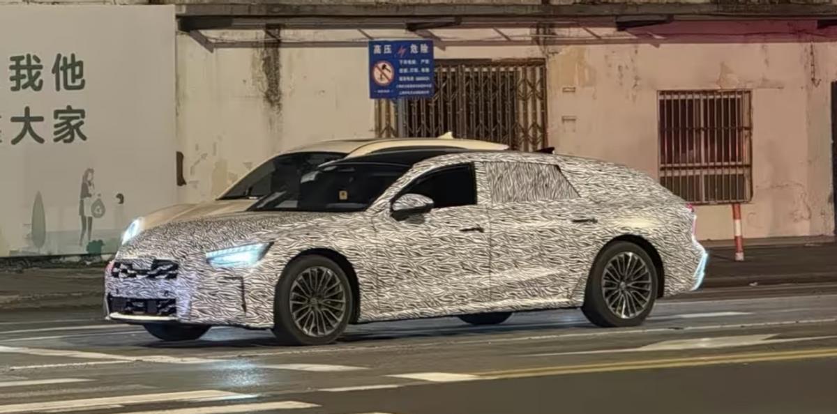 透过厚重的伪装,我们看到,新车整体的前脸造型还是和奥迪A6 Avant有点相似的,大尺寸的黑色蜂窝格栅,搭配全新的数字LED大灯组,据说可以改变大灯图案,依然很凶狠。