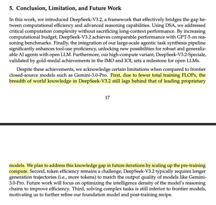 有网友评论说,每篇DeepSeek论文最重要的部分永远是“结论、局限性与未来工作”部分。这次的技术报告也不例外,他们说:“首先,由于总训练FLOPs较少,DeepSeek-V3.2的世界知识广度仍落后于领先的闭源模型。我们计划在后续版本中,通过扩大预训练算力来弥补这一知识差距。”