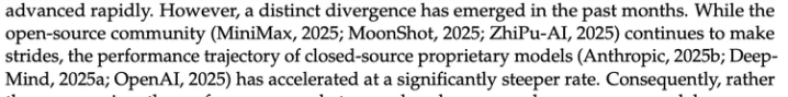 技术报告Introduction部分有句话值得注意,“过去几个月,开源社区虽然在持续进步,但闭源模型的性能轨迹正在以更陡峭的速度加速。差距不是在收窄,而是在扩大。”同时点出了当前开源模型的三个核心短板: